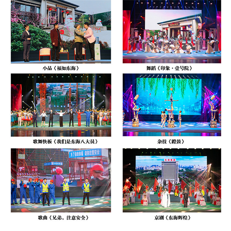 整臺晚會以贊頌新時代東海集團(tuán)發(fā)展成果、弘揚企業(yè)“正能量”為主旋律,“東海品質(zhì)”貫穿始終,90%的節(jié)目為原創(chuàng)。在形式上除了舞蹈、歌曲類,還有快板、詩朗誦、小品、京劇、相聲等,可謂形式多樣。整臺晚會,集思想性、藝術(shù)性、娛樂性、群眾性于一體,寓意深刻、雅俗共賞、詼諧幽默,受到廣大員工的一致好評。東海集團(tuán)員工更是參與其中,他們脫下工裝,換上華服,站在舞臺上,展現(xiàn)出他們工作之外的另一面,以優(yōu)美的身姿,嘹亮的歌喉,真情的演藝,唱出對企業(yè)、對工作崗位的無限熱愛,舞出對東海集團(tuán)美好明天的向往。晚會在宏大的《東海情懷》歌舞中落下帷幕。