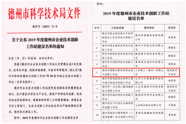 12月24日,德州市科學(xué)技術(shù)局公布了2019年度德州市企業(yè)技術(shù)創(chuàng)新工作站建設(shè)名單,根據(jù)《德州市企業(yè)技術(shù)創(chuàng)新工作站認(rèn)定管理辦法》有關(guān)規(guī)定,經(jīng)單位申報(bào)、逐級(jí)審核推薦、專家評(píng)審等程序,認(rèn)定三東筑工(德州)有限公司為德州市裝配式新體系研發(fā)創(chuàng)新工作站。