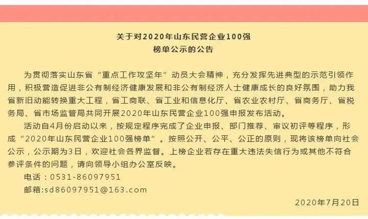 10月20日,2020年“山東民營企業(yè)100強”榜單發(fā)布,東海集團再次榮登榜單,充分彰顯了集團的綜合實力。據(jù)悉,本次評選和發(fā)布由省工商聯(lián)、省工業(yè)和信息化廳、省農(nóng)業(yè)農(nóng)村廳、省商務(wù)廳、省稅務(wù)局、省市場監(jiān)管局共同組織,旨在發(fā)揮先進典型的示范引領(lǐng)作用,積極營造促進民營經(jīng)濟發(fā)展的良好氛圍,這也是東海集團第四次入榜,2020年比2019年公布的榜單前進了10名,位列第83位,為德州市上榜兩家民企之一。