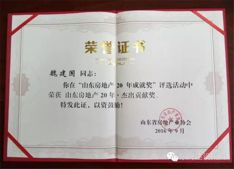 獎項在全行業(yè)內(nèi)開展,不限于會員。全省共推薦上報杰出貢獻(xiàn)獎34人,基本涵蓋了各地最優(yōu)秀的房地產(chǎn)企業(yè)家。經(jīng)專家評審,最終有10名房地產(chǎn)企業(yè)家獲得“山東房地產(chǎn)20年·杰出貢獻(xiàn)獎”。魏建國董事長以其在房地產(chǎn)業(yè)的卓越成就,高分當(dāng)選,并成為德州市唯一當(dāng)選的房地產(chǎn)企業(yè)家。 魏建國帶領(lǐng)他的團(tuán)隊,自經(jīng)營房地產(chǎn)業(yè)以來,始終秉持 “高起點(diǎn)規(guī)劃、高品位開發(fā)、高質(zhì)量建設(shè)”和 “品質(zhì)等于生命,信譽(yù)等于靈魂”的經(jīng)營理念,通過多年的拼搏奮斗和不斷創(chuàng)新,向社會奉獻(xiàn)了一大批高檔精品樓盤。先后開發(fā)建成了“東?!がF(xiàn)代城”、“東?!ぬ煊胥懗恰?、“東?!そ瘃R商城”、“東?!じ毁F苑”、“東?!ぐ屠璩恰薄啊|?!は愀鄢恰钡仁畮讉€項目,本地還有“德州壹號院”和“東?!P凰城”兩個項目40多萬平即將開工建設(shè)。東海在立足德州,深耕本土的同時,積極實施走出去戰(zhàn)略,與成都永利融投資有限公司聯(lián)合開發(fā)的上海閔行項目于今年8月份正式簽約。所有建成樓盤,均得到了政府、業(yè)界專家和廣大業(yè)主的一致好評。東海地產(chǎn)先后創(chuàng)造了德州同行業(yè)40多項第一,許多都是填補(bǔ)了德州歷史的空白?!皷|?!ぐ屠璩恰笔堑轮菔讉€榮獲國家行業(yè)最高獎“廣廈獎”和2A級住宅小區(qū)項目?!皷|海·香港城”在住建部專家驗收后稱,可與一線品牌開發(fā)企業(yè)的產(chǎn)品相媲美,在獲得“廣廈獎”候選項目同時,又被評為3A級住宅小區(qū)。
