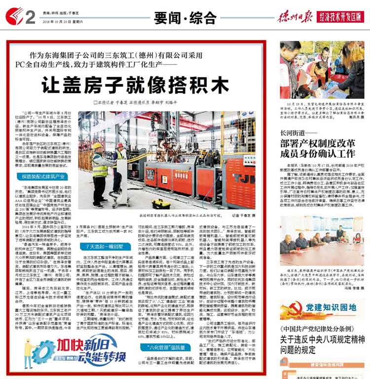 德州日?qǐng)?bào)重點(diǎn)報(bào)道:讓蓋房子就像搭積木——三東筑工(德州)有限公司致力于建筑構(gòu)件工廠化生產(chǎn)