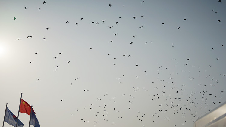 一群喜鵲從東海天下項(xiàng)目上空飛過