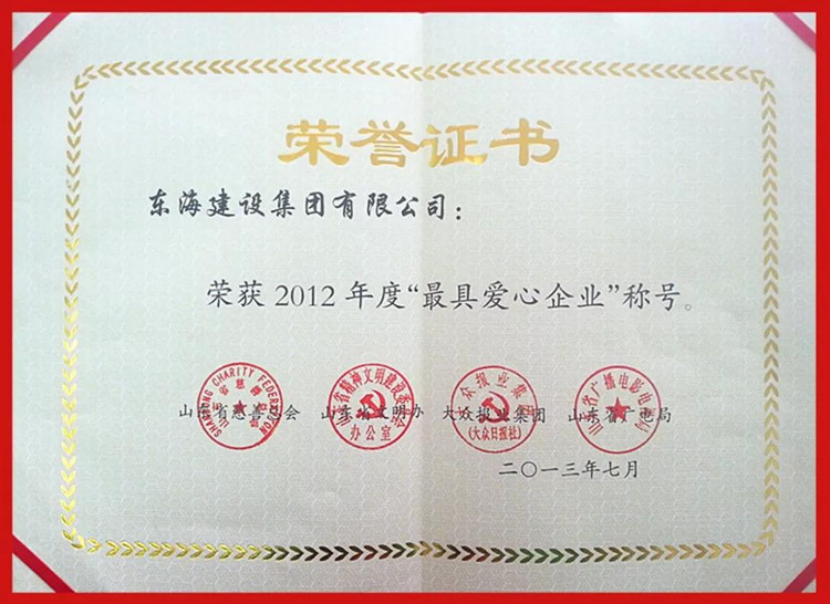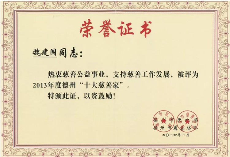 東海集團自成立以來,努力做到發(fā)展不忘回報社會,將“社會效益優(yōu)先,企業(yè)利益在后”載入東海集團企業(yè)文化理念中,一直把關心支持社會公益事業(yè)特別是教育事業(yè),作為企業(yè)應盡的責任,相繼參與了“春蕾行動”、“童緣行動”、“朝陽助學”等活動,累計向社會捐款捐物2800多萬元,受到政府和社會的廣泛贊譽。集團先后多次獲得省市“最具愛心捐贈企業(yè)”、“山東省民營企業(yè)公益之星”、“捐資助學先進單位”等榮譽,魏建國董事長更是被評為德州市“十大慈善家”、“最具愛心捐贈個人”等榮譽。