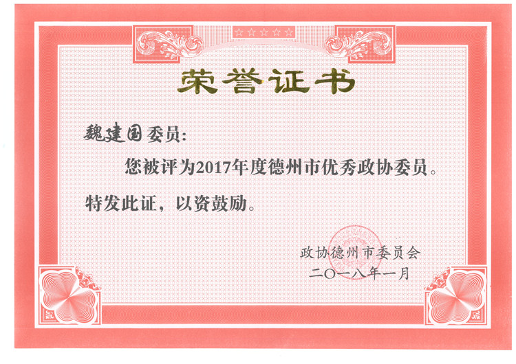 魏建國帶領(lǐng)他的企業(yè),為促進(jìn)地方經(jīng)濟(jì)和社會各項(xiàng)事業(yè)發(fā)展作岀了重要貢獻(xiàn),各級黨委政府和社會各界也給予了他崇高的榮譽(yù)。他先后榮任省政協(xié)委員、省總商會副會長和巿政協(xié)常委等多項(xiàng)社會職務(wù),并先后榮獲山東省優(yōu)秀中國特色社會主義事業(yè)建設(shè)者、全省建筑業(yè)先進(jìn)個(gè)人并記三等功、山東省勞動(dòng)模范、德州市優(yōu)秀政協(xié)委員、德州市誠實(shí)守信道德模范等榮譽(yù)。
