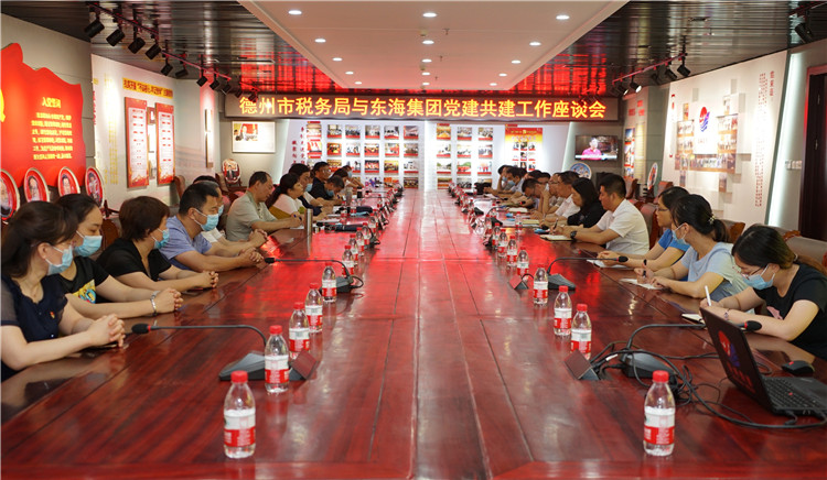 在“七一”來(lái)臨之際,為深化“不忘初心 牢記使命”主題教育,豐富黨日活動(dòng)。6月22日下午,德州市稅務(wù)局和東海集團(tuán)黨建共建座談會(huì)在東海集團(tuán)黨員活動(dòng)室召開,市稅務(wù)局黨委委員、副局長(zhǎng)王秀榮帶領(lǐng)市稅務(wù)稽查局黨支部、第一稽查黨支部、貨勞黨支部30多名黨員參加活動(dòng)。東海集團(tuán)黨委書記蘇振水、副總會(huì)計(jì)師薛梅帶領(lǐng)集團(tuán)機(jī)關(guān)黨支部、開發(fā)集團(tuán)黨支部20名黨員參加。