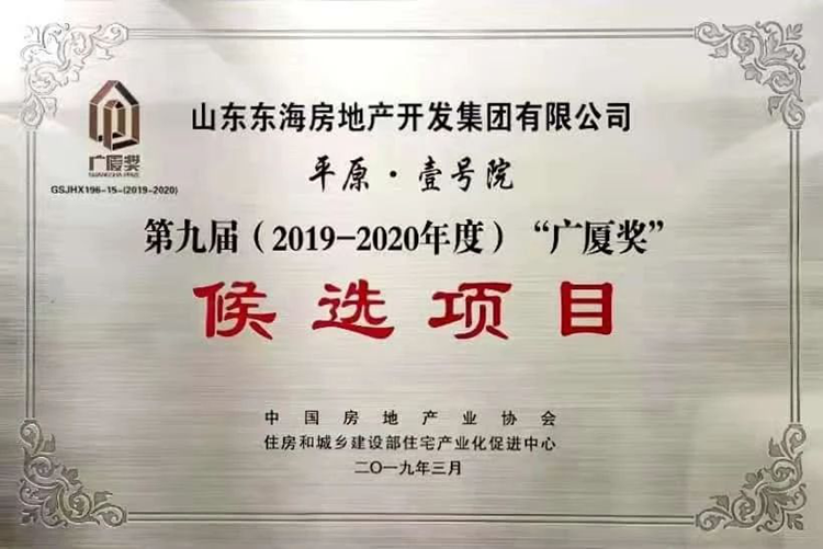 2019-2020年度的第九屆廣廈獎評選,平原壹號院順利通過廣廈獎初審評定。東海集團開發(fā)建設的項目前期已先后有巴黎城、香港城2個項目通過3A級住宅評審并榮獲“廣廈獎”;德州壹號院、東海玉河院子、臨邑東海院子、平原壹號院、鄒城東海院子、東城壹號院、禹城東海城相繼通過3A級住宅和“廣廈獎”初審,截止2019年東海集團共有9個項目獲此殊榮,在全市及全省開發(fā)企業(yè)中獨占鰲頭、名列前茅。