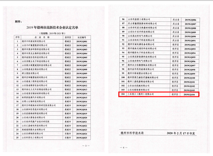 近日,德州市科技局公布了《2019年德州市高新技術企業(yè)認定名單》。根據《德州市高新技術企業(yè)認定辦法》,經德州市高新技術企業(yè)認定管理機構組織企業(yè)申報、逐級審核、現場考察、專家評審、網上公示等程序,最終,三東筑工(德州)有限公司順利通過德州市高新技術企業(yè)認定。